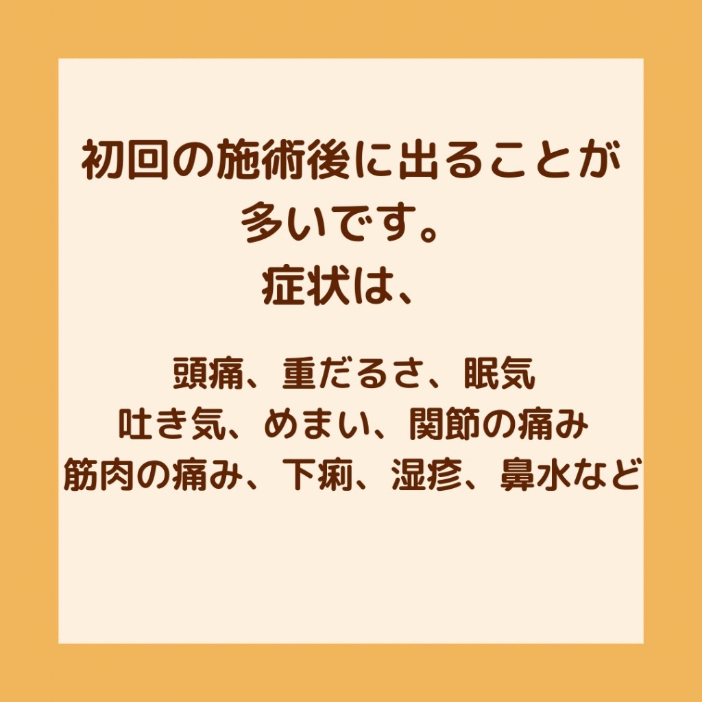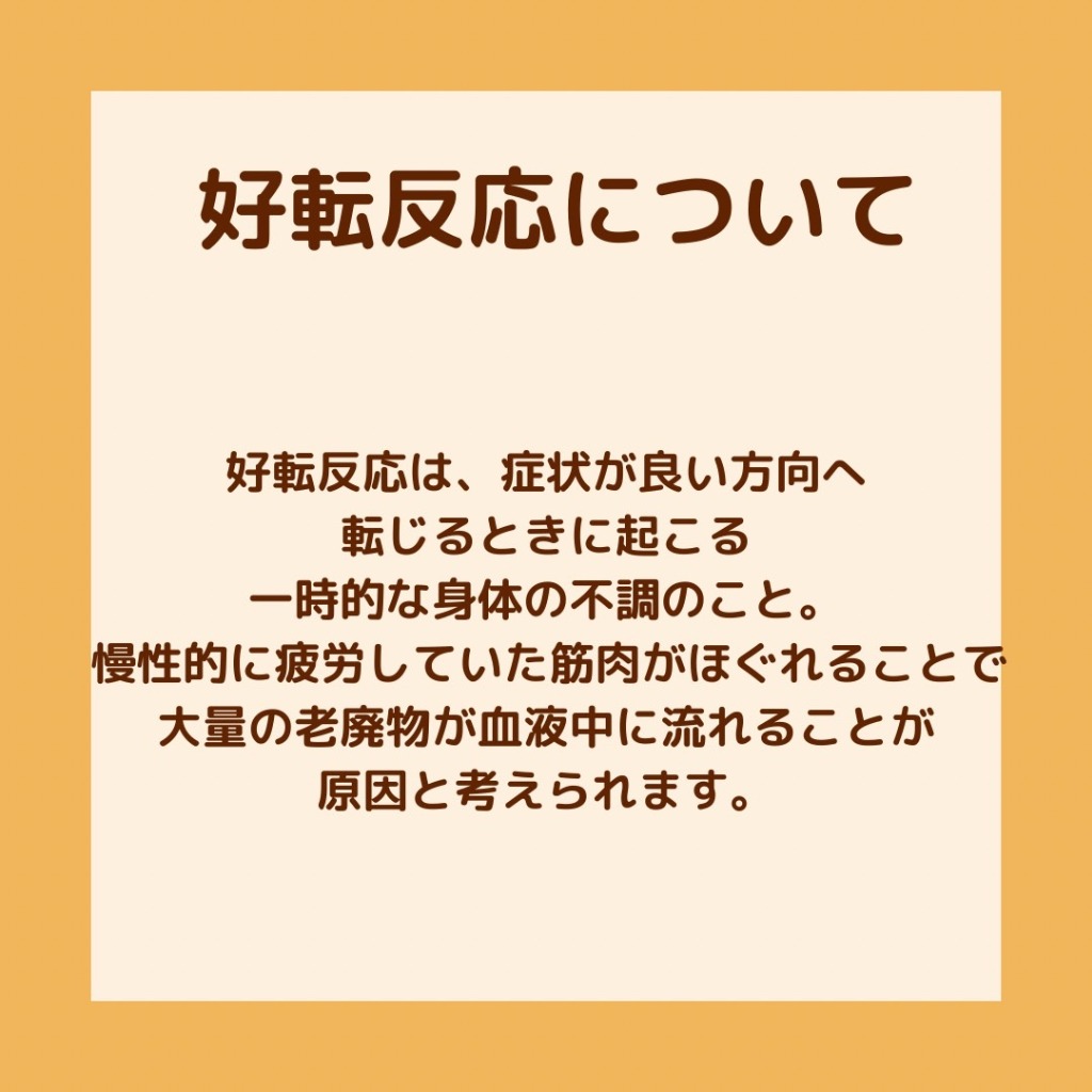 好転反応…症状が良い方向へ転じるときに起こる一時的な身体の不調のこと。慢性的に疲労していた筋肉がほぐれることにより、大量の老廃物が体内を巡り起こる。
