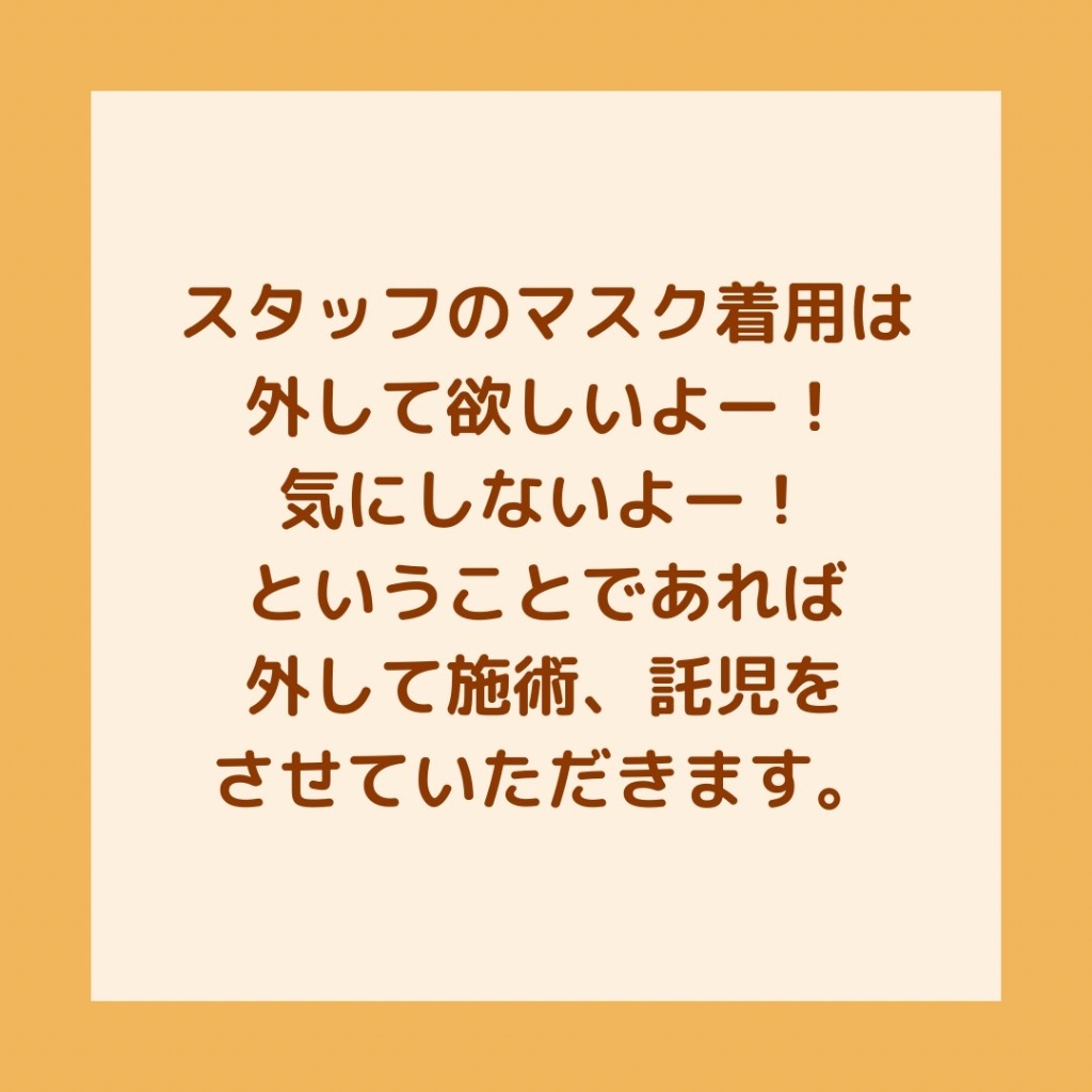 施術の際など、息が苦しくなる可能性のある時は、マスクを外して受けていただいて🆗